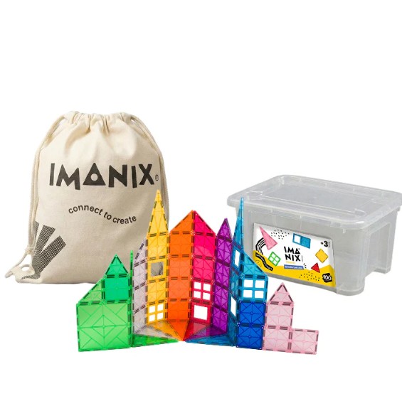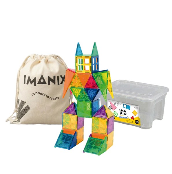 Set infantil de piezas magnéticas translúcidas IMANIX, presentado en bolsa y contenedor de almacenamiento. Favorece el juego libre, la creatividad, la coordinación y la construcción de figuras en casa o en aula. Su formato invita a explorar colores, formas y equilibrio de manera entretenida.
