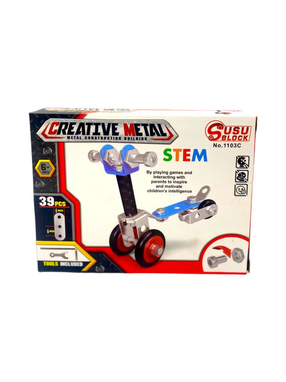 Juego de construcción metálico STEM con 39 piezas, ideal para fomentar la creatividad, el pensamiento lógico y la motricidad fina a través del armado manual y el aprendizaje práctico