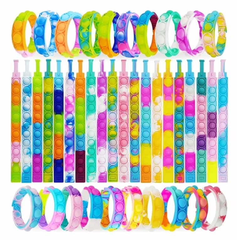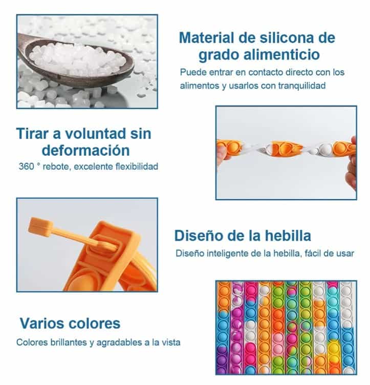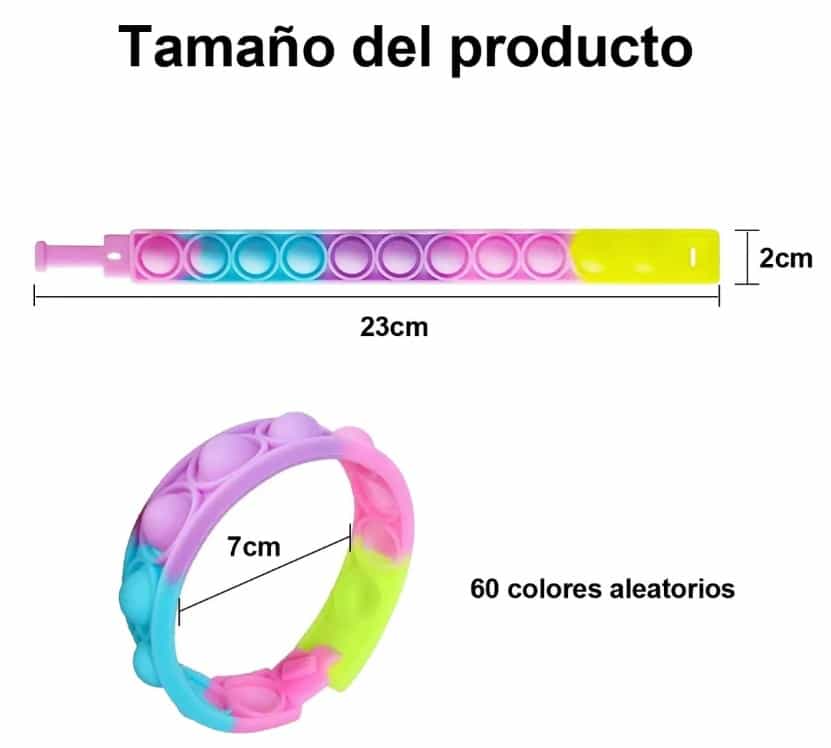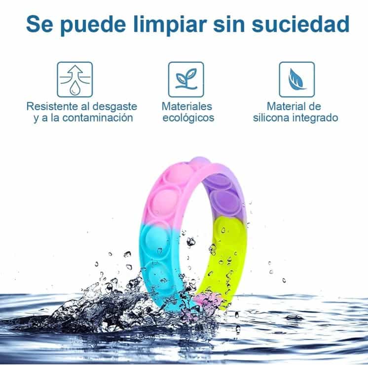 Pulsera sensorial hecha en silicona flexible, suave y cómoda. Se puede estirar, girar, tocar y manipular sin riesgo.